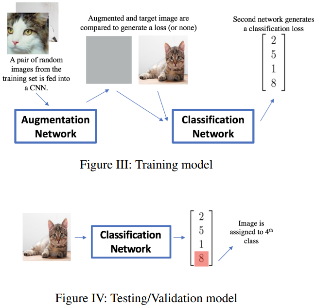 그림3과 그림4는 학습 가능한 데이터 증강 모듈을 추가했을 때 학습 및 평가 과정을 보여주고 있습니다. 학습할 때는 데이터 증강을 위한 네트워크인 Augmentation Network를 이용하죠. 본 논문에서는 이를 GAN으로 정의하고 사용하였습니다.