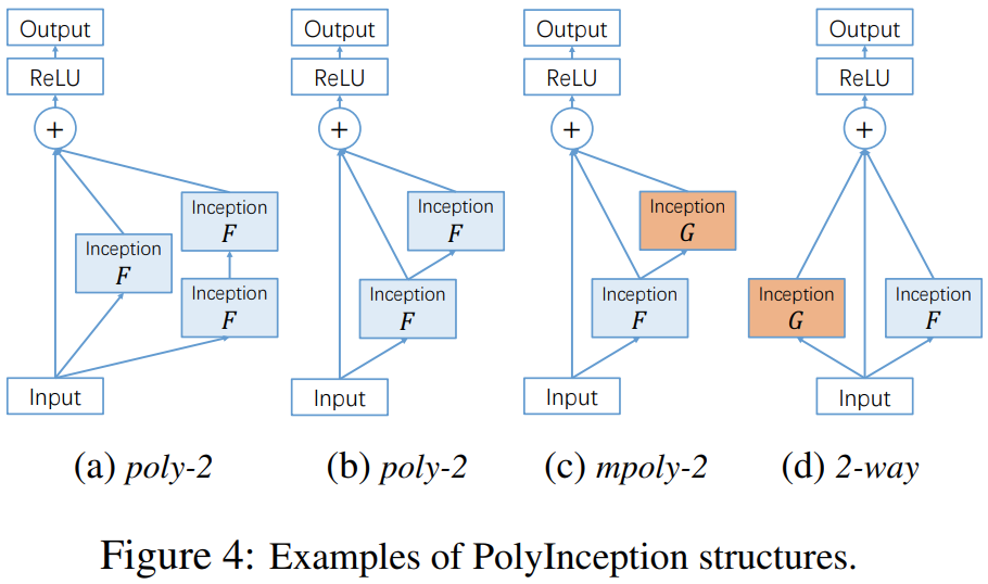 즉, 기존의 residual block을 합성함수의 형태로 사용함으로써 residual path의 복잡성을 증가시키고 이는 diversity를 늘리게 되는 결과를 얻는 것이죠. 그림4의 (a)는 위 수식을 도식화한 블록 다이어그램입니다. 3개의 path로 구성되어 있으며 각각 identity path $I$, 1차 residual block path $F$, 마지막으로 2차 residual block path $F^{2}$가 됩니다. 이와 같이 다항식 (polynomial)의 합성으로 구성하기 때문에 PolyInception이 되는 것이죠.