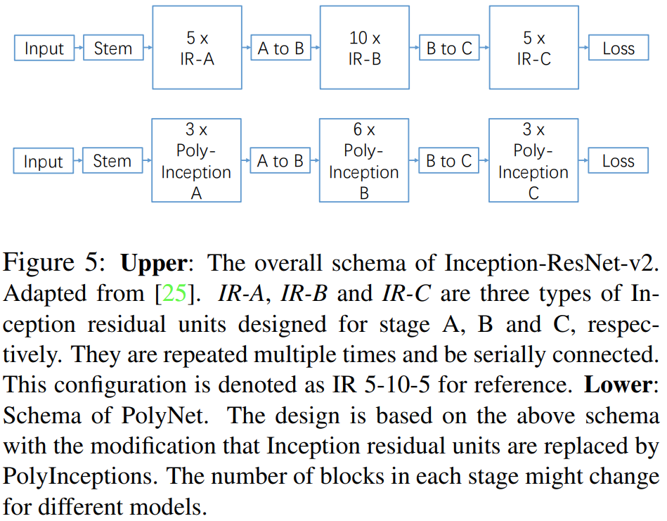 다음으로 본 논문에서는 Inception-ResNet-v2 (IR-v2)를 PolyInception Module로 바꾸기 위한 실험을 진행합니다. 그림5의 위쪽 그림은 IR-v2에서 각 스테이지 (A, B, C)를 5번, 10번, 5번 적용한 모델로 이를 표현하기 위해 IR-5-10-5라고 쓰기로 합니다. 해당 모델은 굉장히 큰 편입니다. 이를 빠르게 실험하기 위해 IR-3-6-3으로 변형한 뒤 ablation study를 수행합니다.