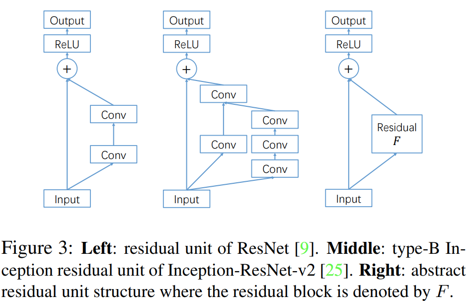 그림3은 ResNet의 블록 (왼쪽), Inception-ResNet의 블록 (가운데)를 도식화한 블록 다이어그램입니다. ResNet이든 Inception-ResNet이든 근본은 Residual Block인 $F$를 어떻게 정의하느냐에 따라서 달라진다는 것 입니다. 하지만, 두 모델 모두 residual path에서는 적으면 2개, 많으면 4개의 합성곱 계층으로밖에 이루어있지 않습니다. 이는 모델의 강력한 표현력을 오히려 제한할 수 도 있습니다. 따라서, 본 논문에서는 이 residual path 부분을 더 개선하고 싶은 것이죠.