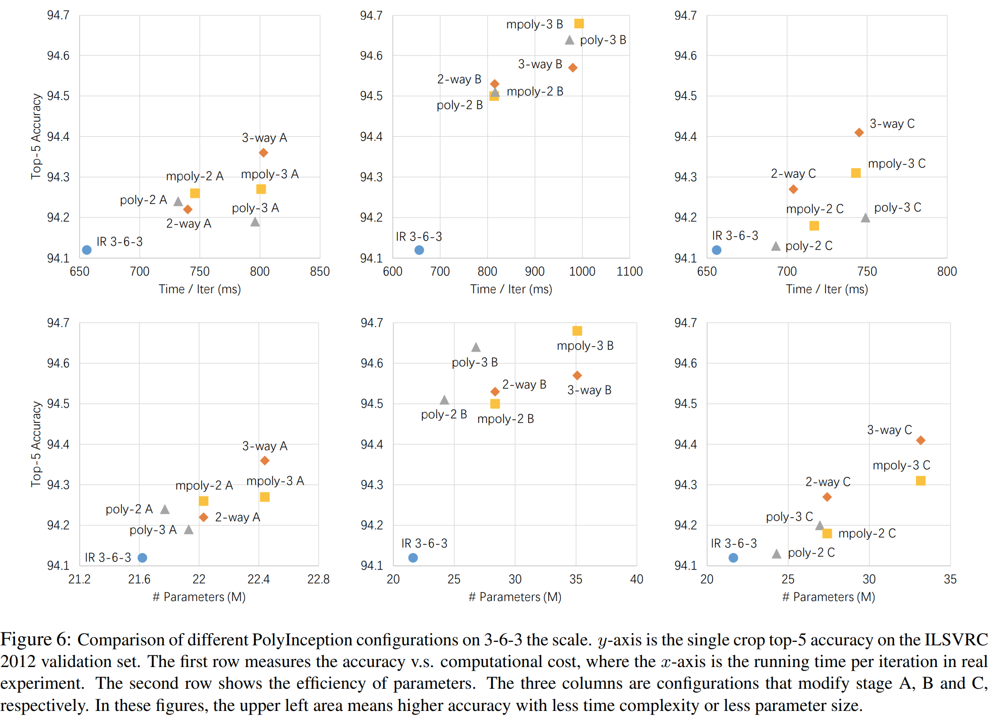 그림6은 비용 (학습 시간/파라미터 개수) vs 성능에 따른 변화를 보여주고 있습니다. 모든 결과에 대해서 IR-3-6-3 보다도 더 높은 결과를 얻을 수 있으며 특히, B stage의 모듈을 PolyInception Module로 교체했을 때 가장 높은 성능향상을 얻을 수 있습니다.
