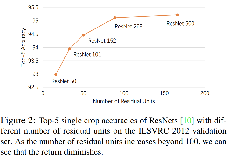 그림2는 깊이의 효율성에 대해서 언급하고 있습니다. ResNet-50 ~ ResNet-269까지는 residual unit의 개수가 많아질수록 그만큼 성능 향상 폭이 두드리지게 나타납니다. 하지만, ResNet-269에서 ResNet-500으로 약 80개 정도에 residual unit을 늘렸음에도 성능은 약 0.1% (4.8% $\rightarrow$ 4.9%)밖에 오르지 않습니다. 즉, 어느정도 깊이가 되면 깊이에 대한 성능 향상은 기대하기 어렵다는 것이죠. 그림은 없지만 이러한 현상은 너비에 대해서도 동일한 결과가 나온다고 합니다.