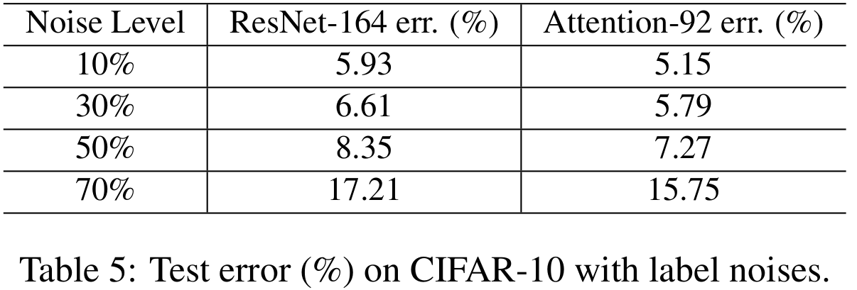 마지막으로 본 논문에서 주장하던 Noisy label에 대한 강건성을 실험합니다. label에 약간의 노이즈를 추가했을 때 RAN은 ResNet에 비해 훨씬 강건한 것을 볼 수 있습니다.