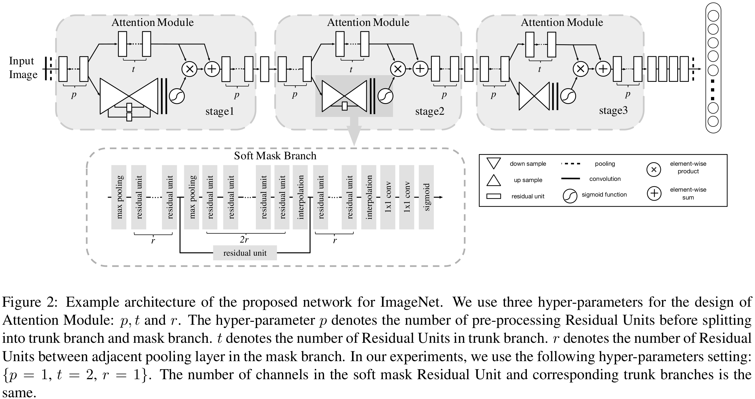 그림2와 표2는 각각 RAN의 블록 다이어그램과 상세 파라미터를 보여주고 있습니다. RAN은 크게 3개의 stage로 구성되어있으며 각 stage에서 위쪽 branch는 trunk branch, 아래쪽 branch는 mask branch입니다.