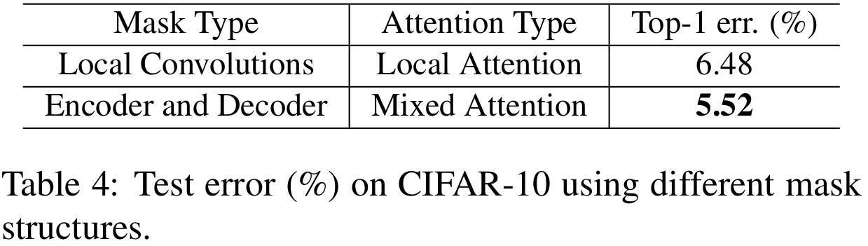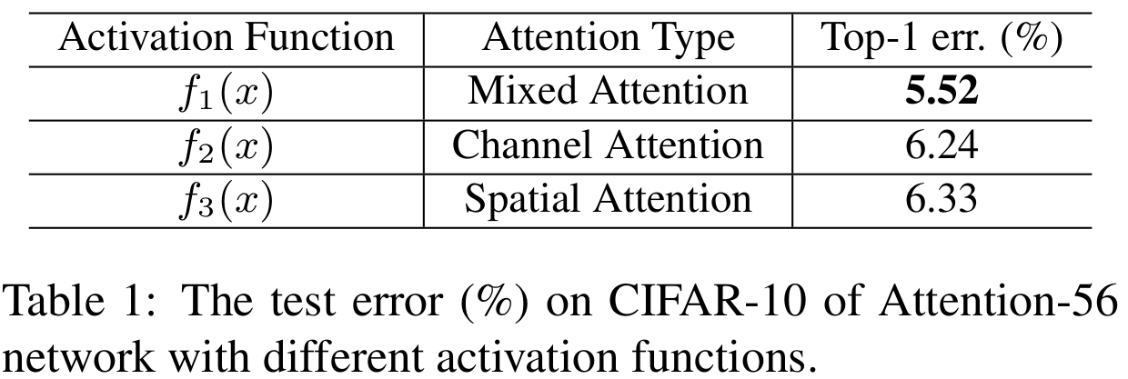 표1은 각 attention 방식 별로 CIFAR10으로 학습했을 때 실험 결과입니다. 결과적으로 mixed attention $f_{1}$이 가장 좋은 성능을 보이고 있습니다.