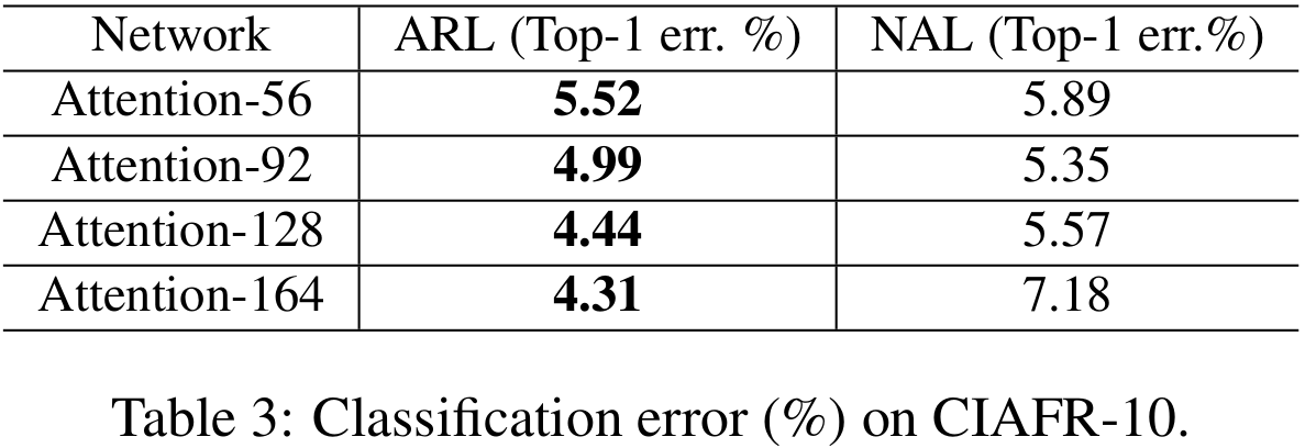 본 논문에서 제안하는 학습 기법 중 하나인 ARL과 Naive Attention Learning (NAL)사이의 성능을 비교합니다.