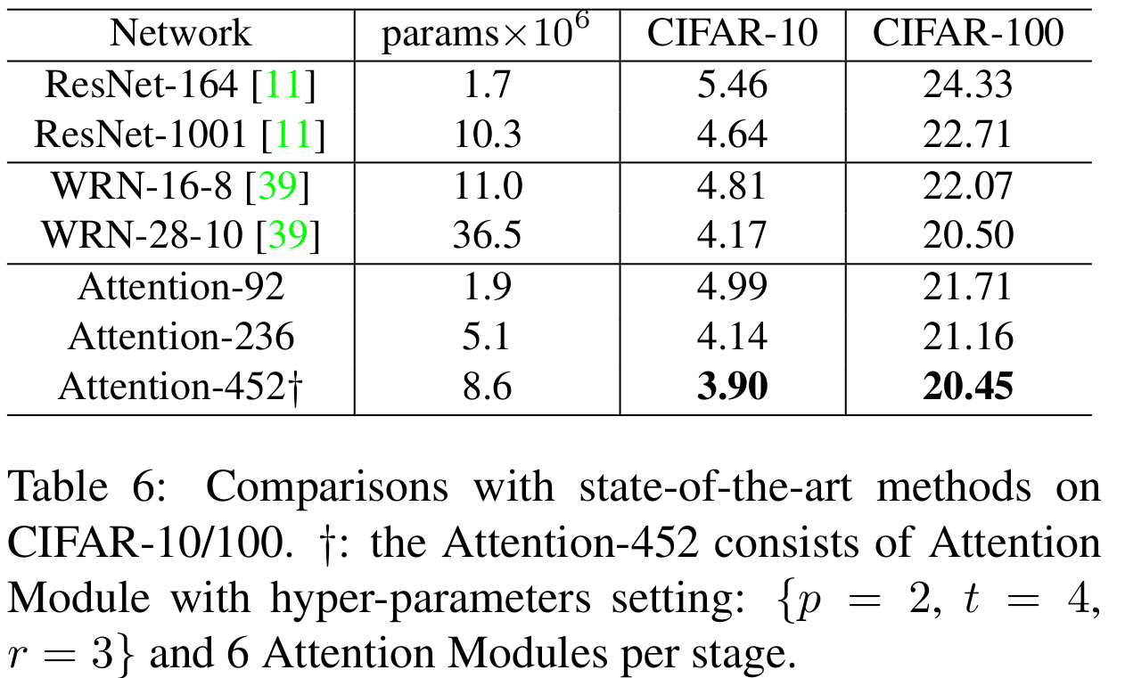 다음으로 CIFAR에서는 ResNet, WRN과의 성능을 비교합니다. RAN은 비교적 적은 파라미터로도 ResNet과 WRN 보다 훨씬 높은 성능 향상을 보이고 있어 효율적인 모델이라고 볼 수 있습니다.