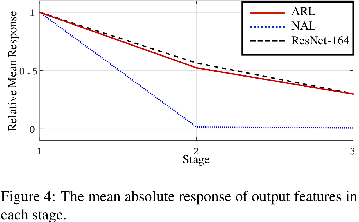 표3은 ARL과 NAL 사이의 성능을 차이를 보여주고 있습니다. 그림4와 함께 보시면 더욱 쉽게 이해가 가실겁니다. 표3에서 깊이가 깊어질수록 NAL의 성능은 오히려 떨어지고 있습니다. 왜냐하면 처음에 말씀드렸듯이 0 ~ 1 사이의 값을 가지는 마스크를 이용하기 때문에 특징 맵들이 점점 0에 수렴하기 때문이라는 말을 하였습니다. 이러한 경향성은 그림4에서도 나타납니다. Stage1에서는 NAL이 어느정도 feature response를 가지고 있지만 깊어질수록 이미 특징 맵들이 0으로 수렴을 해버렸기 때문에 Stage2부터는 feature response가 거의 0이 되고 Stage3에서는 아예 남아잇지 않은 모습입니다. 하지만, ARL은 기존의 ResNet-164와 유사한 feature response를 가지고 있으며 깊어질수록 성능이 향상되는 것을 볼 수 있습니다. 이러한 결과는 ARL의 효율성을 입증합니다.