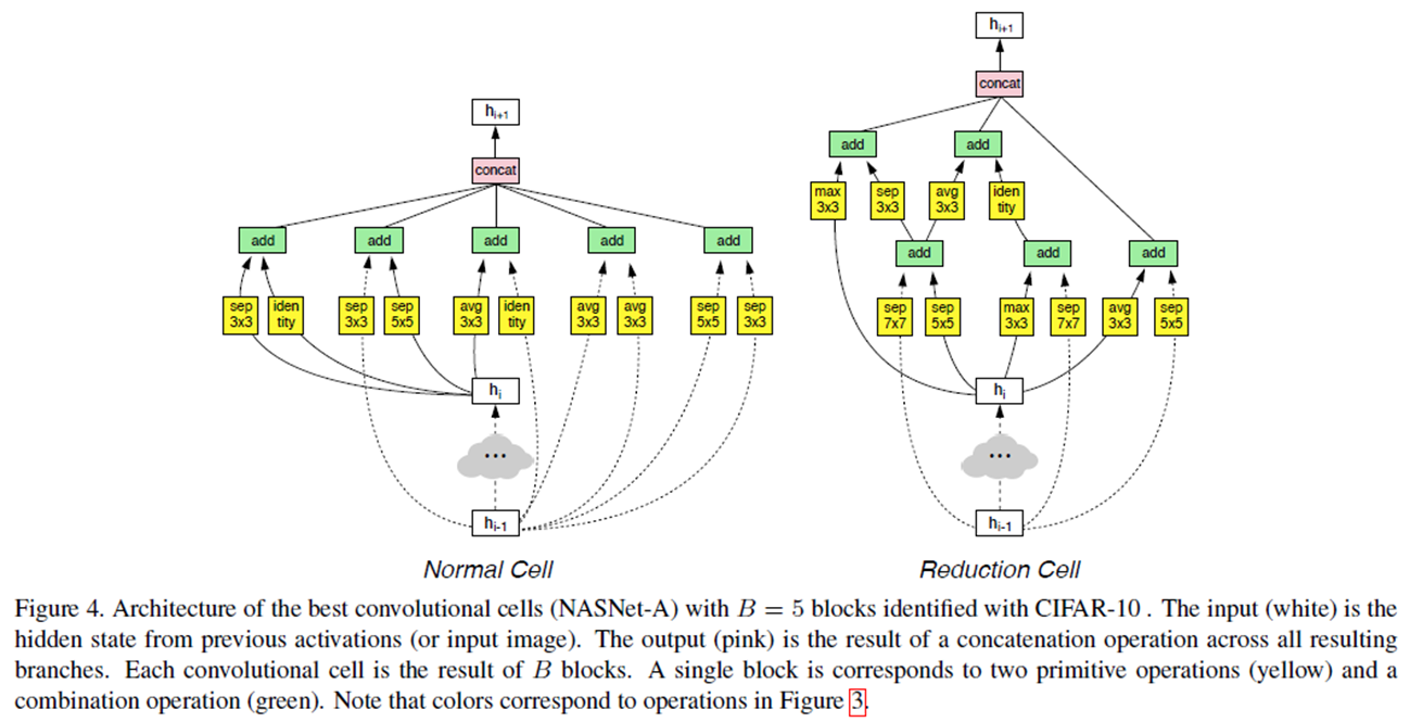 여기서, Convolutional Cell은 Normal Cell과 Reduction Cell 두 가지로 나뉩니다. Normal Cell은 입력 특징 맵과 출력 특징 맵의 해상도가 동일한 Cell이고 Reduction Cell은 절반으로 감소하는 Cell 입니다.