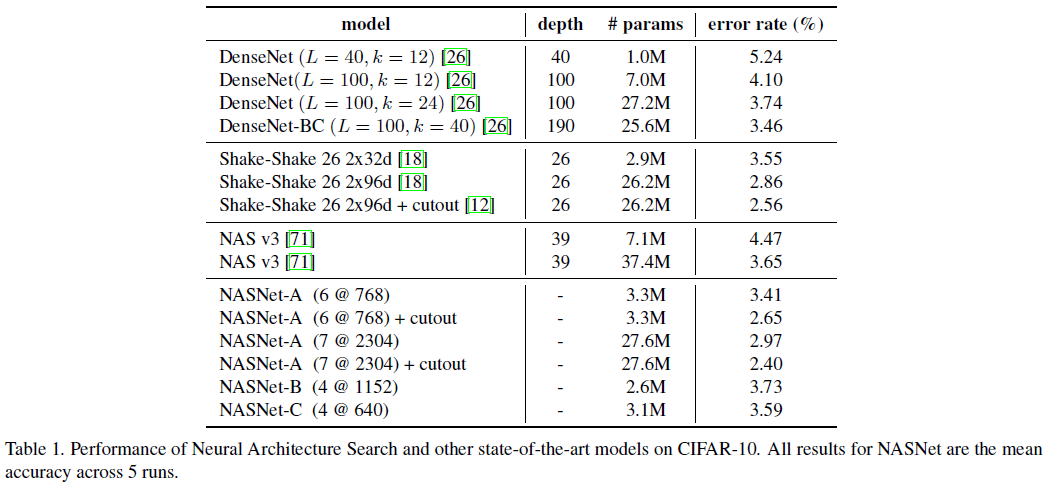 DenseNet과 비교해보면 25.6M개의 파라미터를 가지는 모델과 3.3M개의 파라미터를 가지는 NASNet-A가 거의 유사한 성능을 보이고 있습니다. 유사한 개수의 파라미터로 제한하면 27M개의 파라미터에 대해서 DenseNet은 3.74%, NASNet-A는 2.97%의 오류율을 가지게 됩니다. 이는 기존에 제안된 NAS보다도 훨씬 좋은 성능을 가지고 있음을 볼 수 있습니다.
