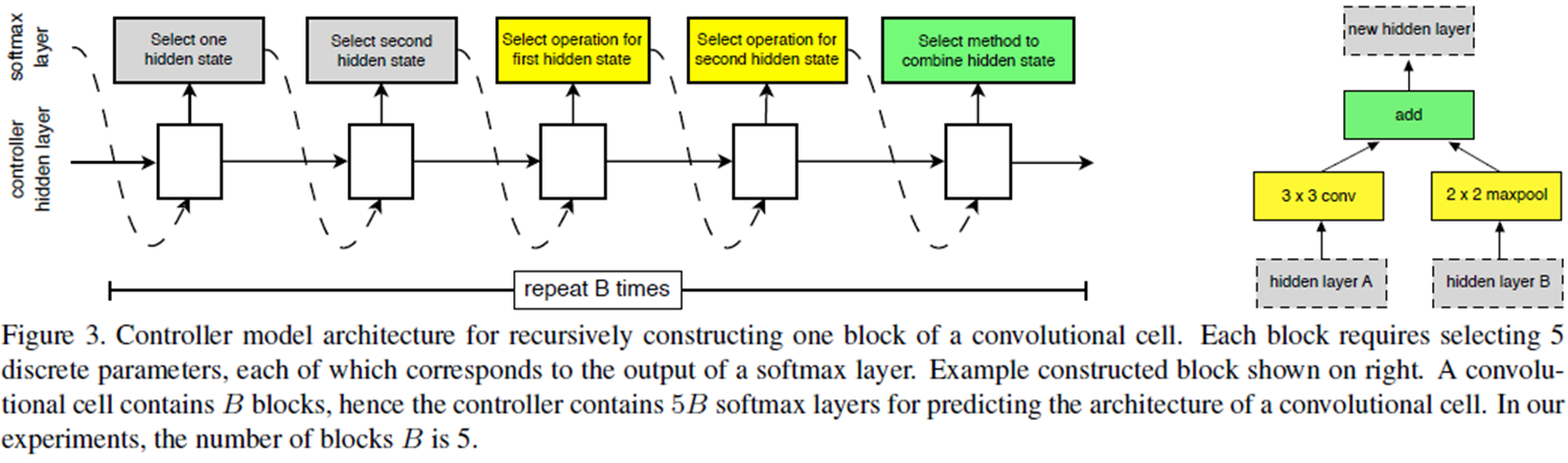 그림3은 NASNet의 전체적인 학습 과정을 보여주고 있습니다. 왼쪽 그림은 Controller RNN을 이용해서 모델을 선택하는 기준을 보여주고 오른쪽 그림은 선택된 하나의 블록의 예시를 보여주고 있습니다. 총 5개의 블록으로 구성되고 각 블록에 해당하는 RNN Cell 모두 독립된 softmax 연산을 포함하고 있습니다.
