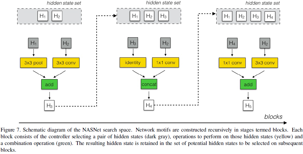그림7은 위 과정을 전체적으로 요약해서 보여주고 있습니다. 블록이 진행됨에 따라서 hidden state set에 점점 hidden state가 쌓이게 되고 연산도 바뀌고 있습니다. NASNet에서는 이러한 과정의 반복횟수를 $B$라고 정의하였습니다. 그리고 예측할 때 Normal Cell과 Reduction Cell 역시 함께 예측하도록 구성하였기 때문에 총 $2 \times 5B$만큼의 예측결과를 얻을 수 있습니다.