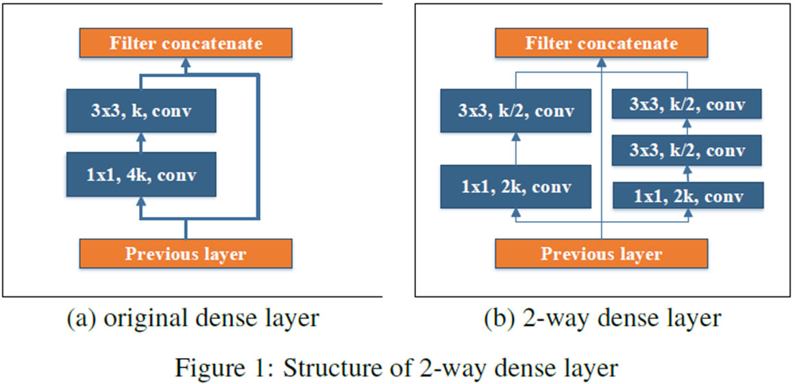 그림1은 기존의 Dense Layer (왼쪽)와 본 논문에서 제안하는 2-Way Dense Layer (오른쪽)의 블록 다이어그램을 보여주고 있습니다. 이 방법은 기존의 GoogLeNet에 영감을 받아서 서로 다른 receptive field를 가지는 multi-path를 두어 multi-scale 정보를 활용할 수 있게 합니다.