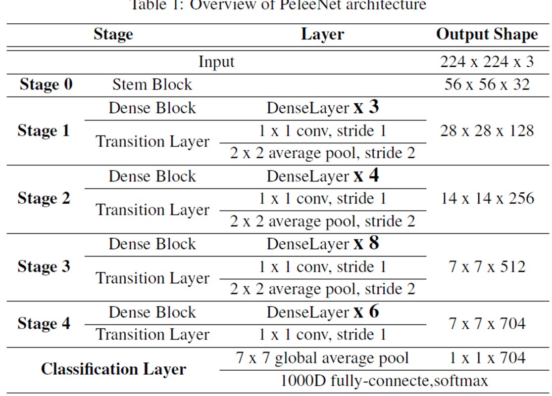 기본적으로 DenseNet은 growth rate가 4로 고정되어 있습니다. 하지만, PeleeNet에서는 블록에 따라 growth rate를 다르게 설정하여 28.5%의 계산 효율성을 증가시킵니다.