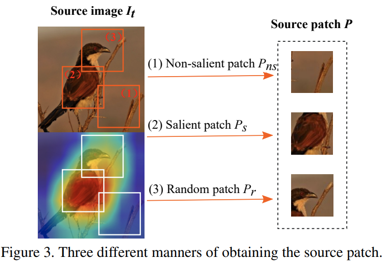 다음에는 어떻게 소스 패치를 선택할지는 분석해보도록 하겠습니다. 그림3에서와 같이 3가지 전략을 생각해볼 수 있죠. 각각 Saliency region, Non-saliency region, Random region 입니다. 표1에서 (6), (7), (8)가 그 실험결과입니다. 일반적으로 저희가 생각했을 때는 소스 영상의 Saliency 정보를 살리기 위해서 saliency 패치를 붙이는 것이 성능이 가장 좋을 것으로 예상하지만 의외로 성능이 가장 낮았습니다. 뿐만 아니라 Random 패치를 붙이는 것이 가장 높은 성능을 달성하였죠. 이는 데이터의 다양성을 증대시키는 것이 더 중요한 결과임을 의미하죠.