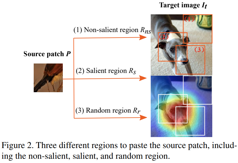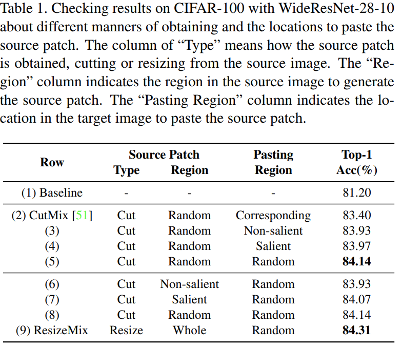 그림2와 같이 이 부분에서는 3가지 전략을 생각해볼 수 있습니다. 각각 Saliency region, Non-saliency region, Random region 입니다. 표1에서 CutMix 아래의 (3), (4), (5)가 그 실험결과입니다. 일반적으로 저희가 생각했을 때는 타겟 영상의 Saliency 정보를 살리기 위해서 Non-saliency region에 붙이는 것이 성능이 가장 좋을 것으로 예상하지만 의외로 성능이 가장 낮았습니다. 뿐만 아니라 Random region에 붙이는 것이 가장 높은 성능을 달성하였죠. 이는 데이터의 다양성을 증대시키는 것이 더 중요한 결과임을 의미하죠.