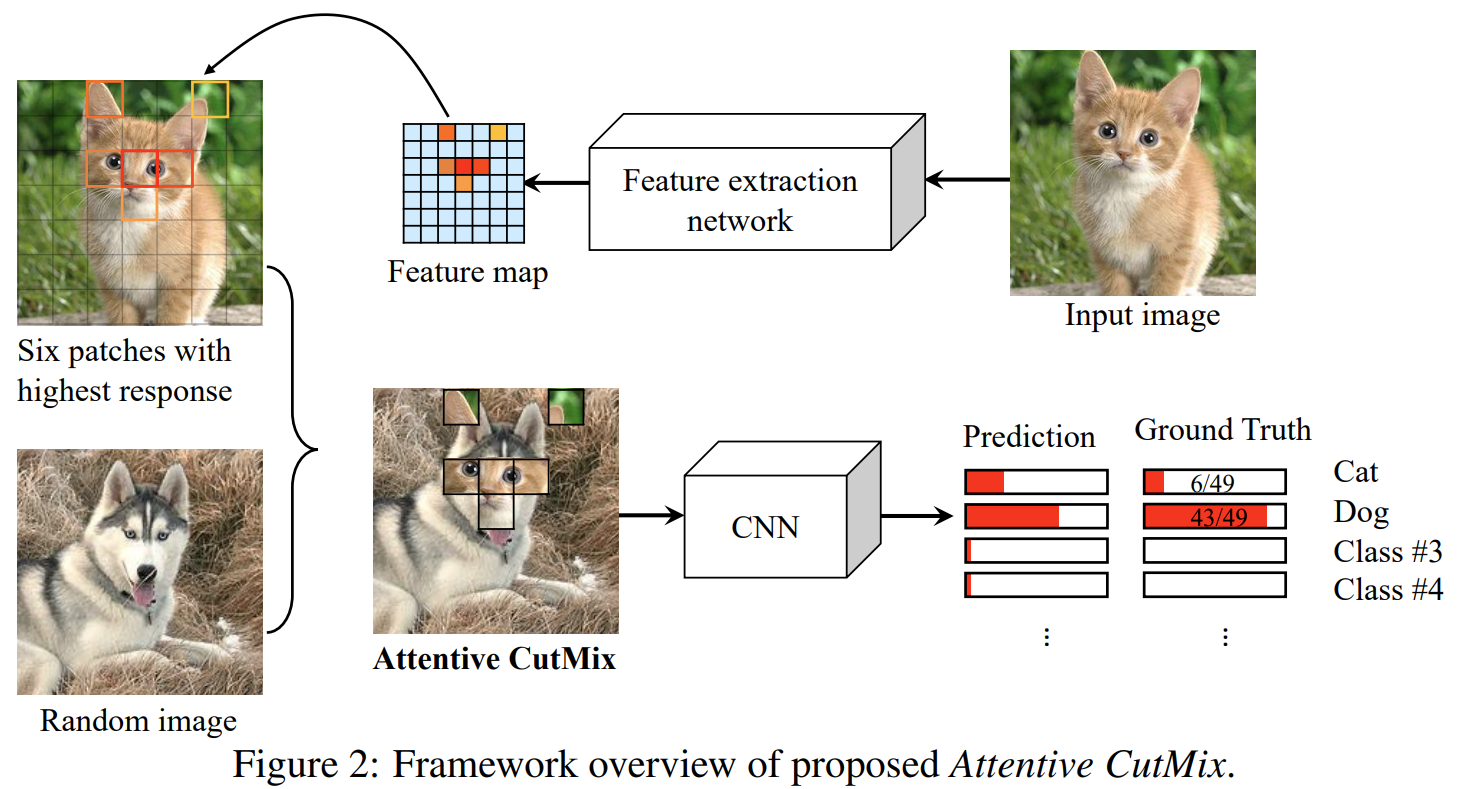 그림1은 Randomness로 인한 MixUp, CutOut, CutMix의 문제점을 보여주고 있습니다. 핵심은 심층 신경망이 "개"라고 판단하거나 "고양이"라고 판단할만한 discriminative feature가 삭제된다는 것을 보여주고 있습니다. 그렇다면 이 discriminative feature를 어떻게 보존할 수 있을까요? 본 논문에서는 이를 위해 Attentive CutMix를 제안합니다. 그림1의 오른쪽 아래 그림과 같이 고양이라고 판단할만한 패치들은 개 사진에 붙히는 것을 볼 수 있죠.