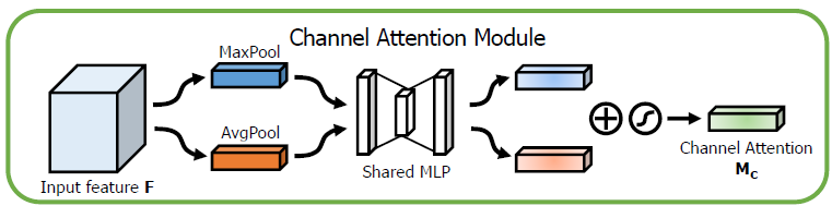 $$\mathbf{M}_{\mathbf{c}} (\mathbf{F}) = \sigma \left( \mathbf{W}_{\mathbf{1}} \left( \mathbf{W}_{\mathbf{0}} \left( \mathbf{F}_{\mathbf{avg}}^{\mathbf{c}} \right) \right ) + \mathbf{W}_{\mathbf{1}} \left( \mathbf{W}_{\mathbf{0}} \left( \mathbf{F}_{\mathbf{max}}^{\mathbf{c}} \right) \right)\right)$$