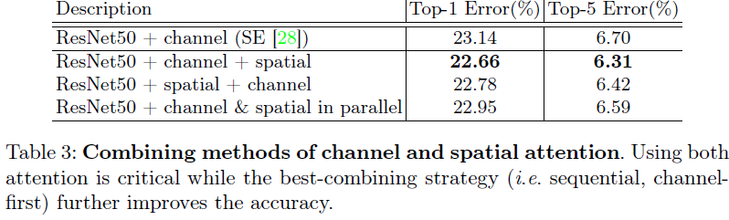 표3은 두 어텐션 모듈의 순서 및 적용하는 방식을 병렬로 바꾸었을 때 성능을 보여주고 있습니다. 결과적으로 channel attention을 적용한 뒤 spatial attention을 적용하는 것이 성능이 가장 높습니다.