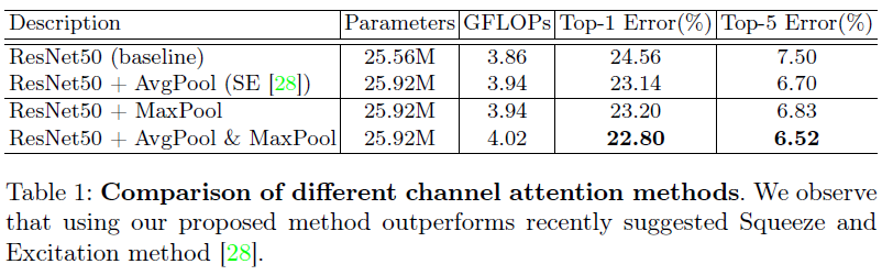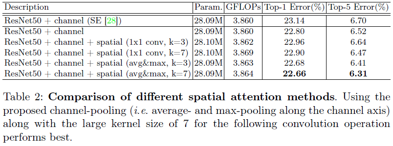 표2는 channel attention에 spatial attention을 적용했을 때 다양한 방식으로 수행했을 때 실험결과를 보여주고 있습니다. 결과적으로 Average Pooling과 Max Pooling을 함께 적용했을 때 가장 좋은 성능을 보이고 있습니다.