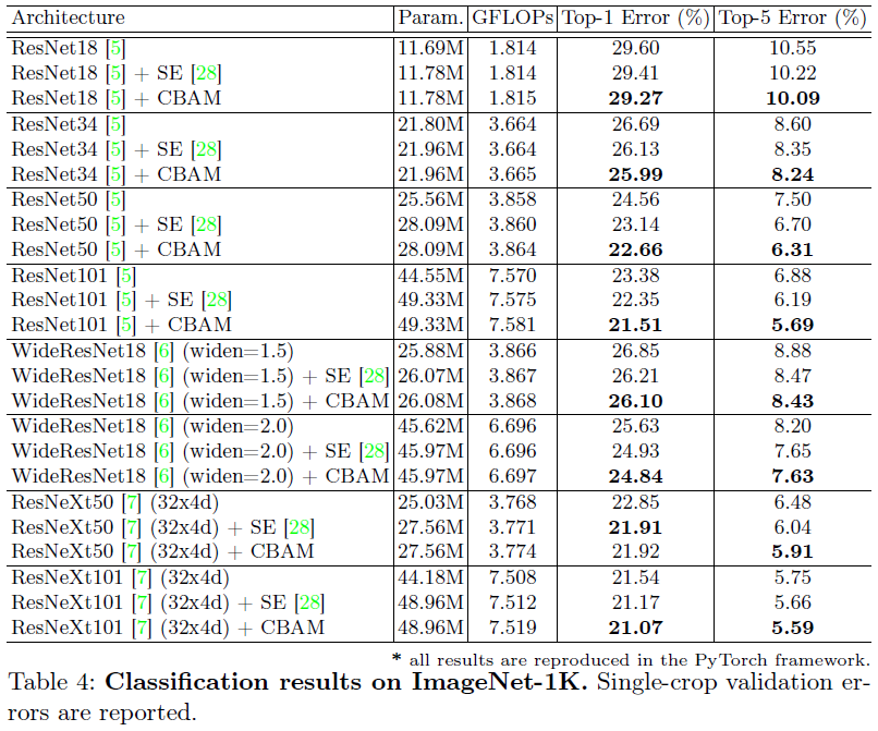 본 논문에서는 CBAM을 추가한 CNN에 대해 ImageNet-1K에서의 분류 성능 및 MS COCO와 VOC2007에서의 객체 탐지 능력을 평가합니다. 일단, 본 논문에서 수행한 절제 연구부터 보도록 하겠습니다.