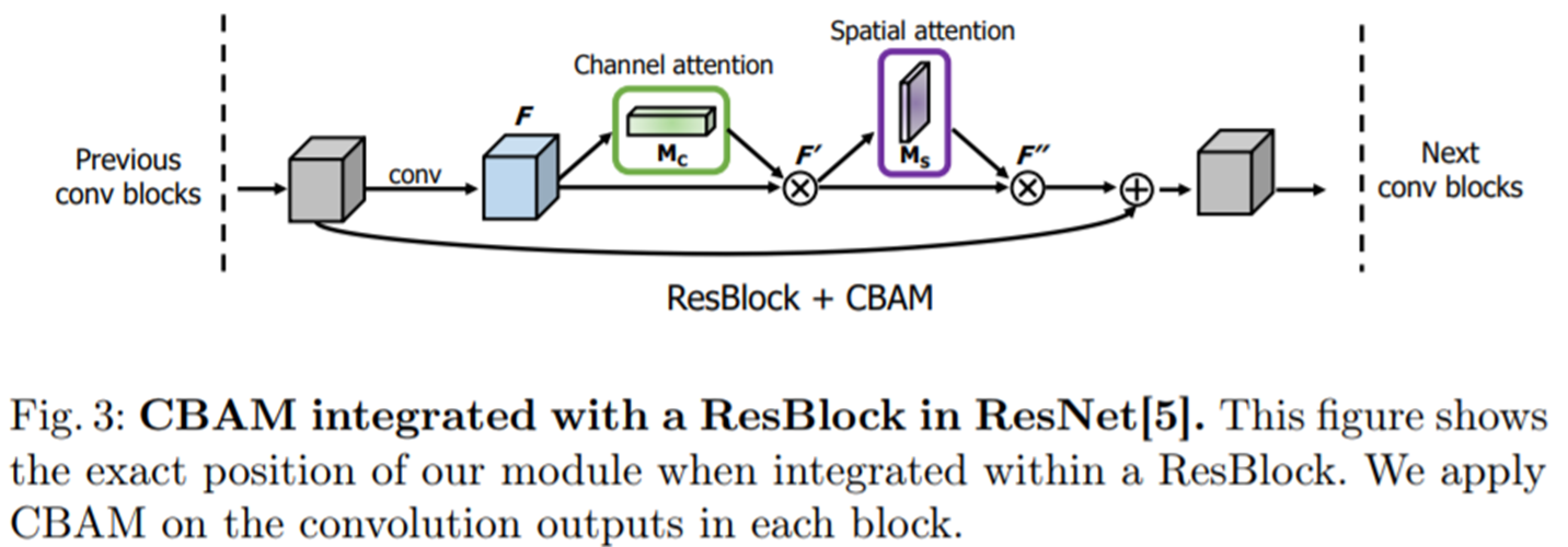 본 논문에서 제안한 CBAM은 그림3과 같이 기존의 ResNet에 쉽게 추가하여 구현될 수 있습니다. 여기서, 기존의 BAM과의 차이점이 나오게 되죠. BAM은 다음 stage로 넘어갈 때 수행됩니다. 하지만, CBAM은 모든 Residual block 내부에 적용할 수 있습니다. 이 부분이 또다른 차이점이 되겠네요.