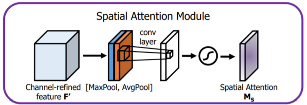 $$\mathbf{M}_{\mathbf{s}} (\mathbf{F}) = \sigma \left( f^{7 \times 7} \left( \left[ \mathbf{F}^{\mathbf{s}}_{\mathbf{avg}}, \mathbf{F}^{\mathbf{s}}_{\mathbf{max}} \right] \right) \right)$$