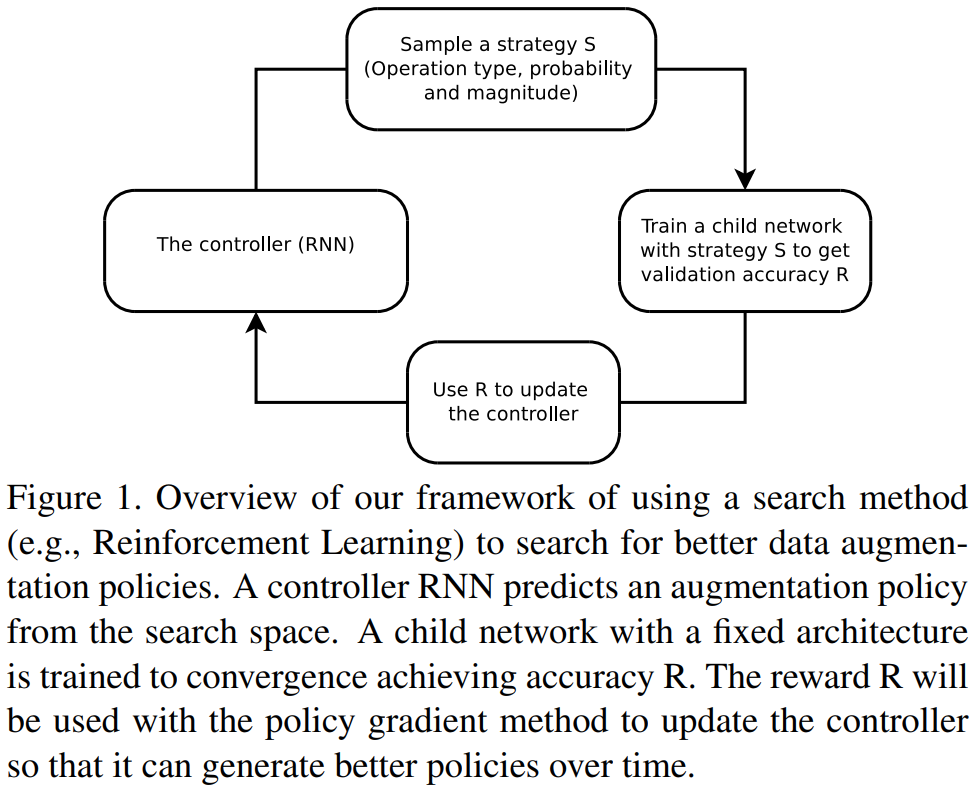 그림1은 AutoAugment의 전체적인 학습 과정을 보여주고 있습니다. 기본적으로 학습되는 과정은 다음과 같습니다.
