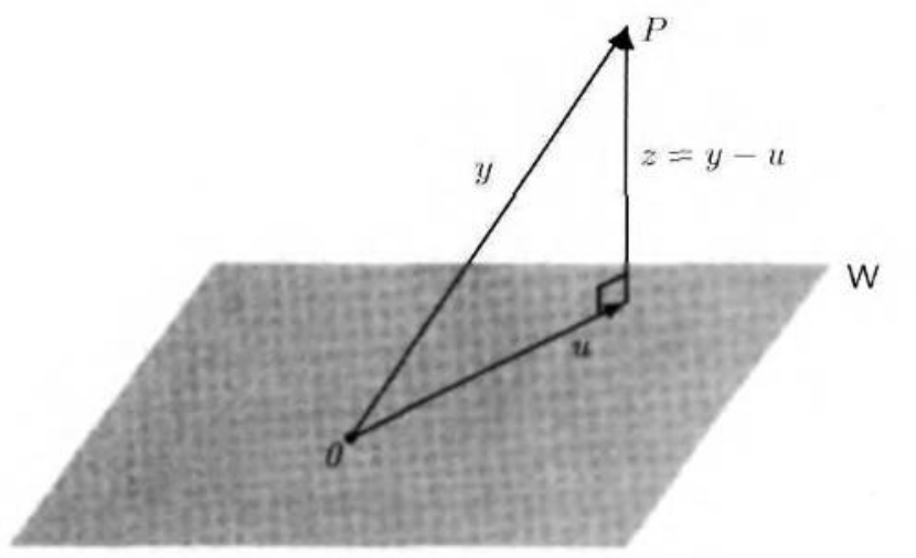 $\{ v_{1}, \dots, v_{k} \}$를 부분공간 $W$의 직교기저 그리고 $u$를 이전에 정의한 대로 $z = y - u$를 만족하는 벡터라고 하자. 이는 자명하게 $u \in W$이고 $y = u + z$이다.