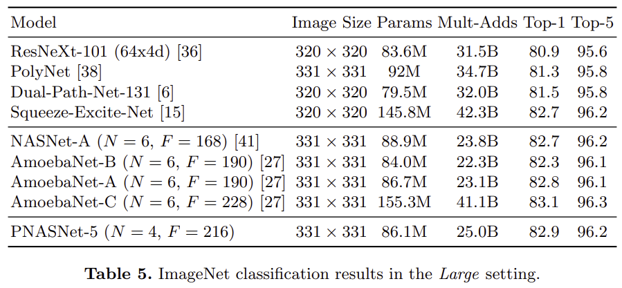 표5는 ImageNet을 기준으로 학습한 실험 결과 입니다. AmeobaNet-C 보다는 성능이 조금 낮거나 비슷하지만 연산량이 파라미터는 절반정도 적은 것을 볼 수 있습니다.