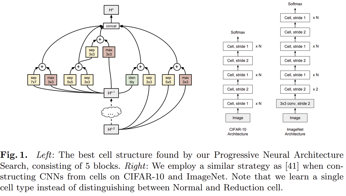 여기서 searching space를 최대한 줄이기 위해 PNAS에서는 NASNet에서 사용되지 않은 operation 개수를 줄여 8개만 사용하였습니다. 다음으로 특징 맵을 합칠 때도 NASNet에서는 대부분 덧셈만 사용했기 때문에 이를 고정하였습니다. 이를 통해, 기존의 NASNet에서는 약 $10^{28}$개의 조합을 가졌지만 PNAS에서는 $10^{12}$개로 대폭 줄이게 됩니다. 따라서, 훨씬 빠른 탐색이 가능하겠죠.
