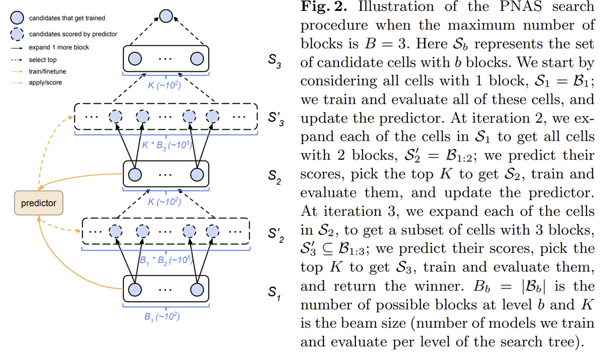 그림2는 PNAS를 이용해서 점진적으로 모델이 커지는 과정을 보여주고 있습니다. 또한 predictor를 정의하여 만들어진 모델에 대한 대략적인 성능을 빠르게 평가하게 되죠.