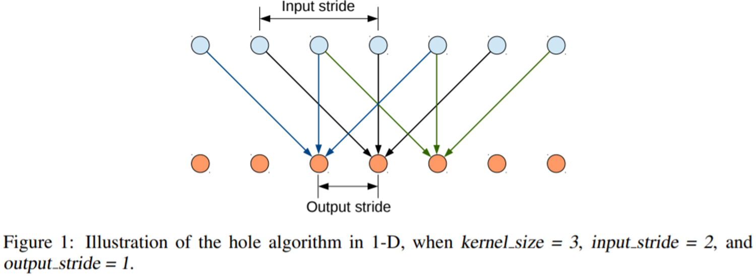 다음으로 가장 중요한 것은 DeepLabV1에 있는 합성곱 연산을 Standard Convolution에서 Atrous Convolution으로 바꾸어줍니다. Atrous Convolution을 가장 쉽게 이해하기 위해 그림 1을 보겠습니다. 일반적으로 합성곱 연산은 한 개의 출력 노드를 얻기 위해 연속된 노드를 활용하게 됩니다. 하지만, Atrous Convolution은 연속된 노드가 아닌 한 칸씩 더 띄워서 입력 노드를 활용하고 있습니다. 이때, 얼마나 띄워서 입력 노드를 선택할 지에 대한 파라미터가 PyTorch 기준으로 dilation $d$이 됩니다. 위 경우에는 $d = 2$가 되겠네요.