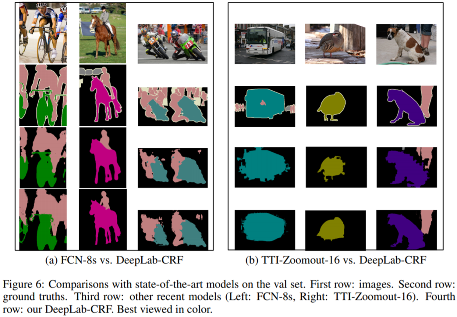 DeepLabV1은 출판된 지 굉장히 오래된 논문이기 때문에 비교할만한 대상이 그리 많지는 않았습니다. 대표적으로 FCN과 비교했을 때 모든 클래스에 대해 굉장히 높은 성능을 얻을 수 있었습니다.