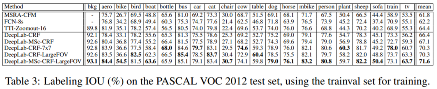DeepLabV1은 출판된 지 굉장히 오래된 논문이기 때문에 비교할만한 대상이 그리 많지는 않았습니다. 대표적으로 FCN과 비교했을 때 모든 클래스에 대해 굉장히 높은 성능을 얻을 수 있었습니다.