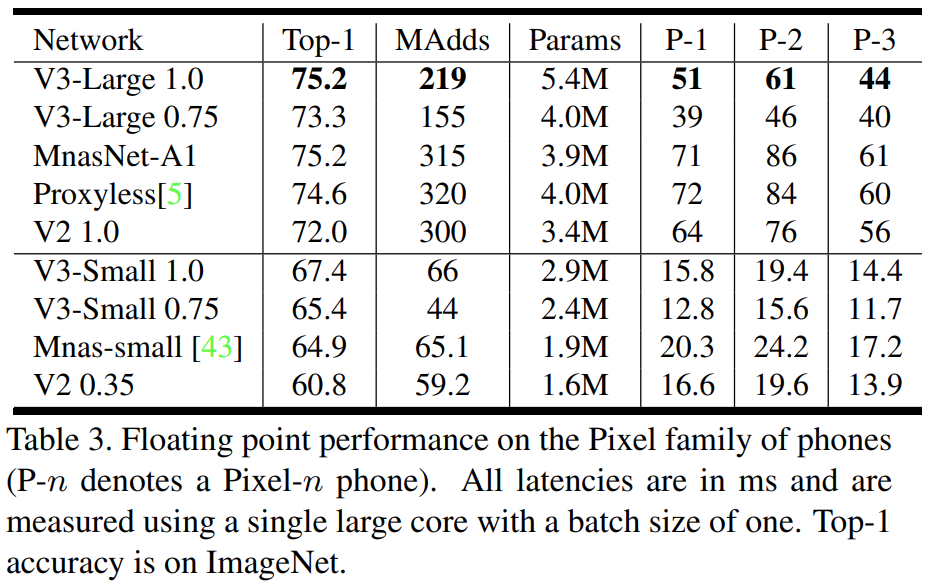 MobileNetV3는 위 표와 같이 다양한 플랫폼에서 효율적으로 높은 성능을 달성하는 것을 볼 수 있습니다.