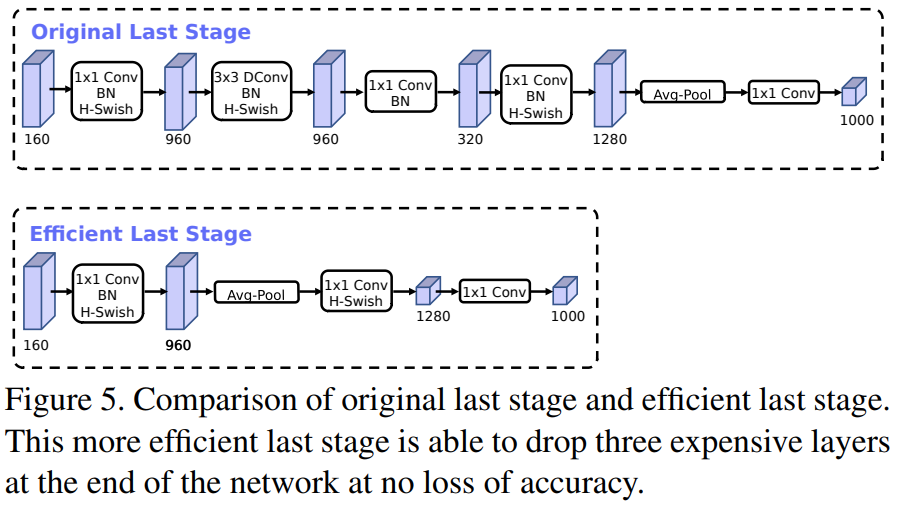 MNASNet과 NetAdapt 알고리즘을 통해 어느정도 괜찮은 모델을 얻었다고 해도 본 논문에서는 더 낮은 레이턴시를 가지는 모델을 얻기 위한 노력을 시행합니다. 이때, 저자는 최종적으로 얻은 모델의 마지막 및 초기 계층은 상대적으로 높은 연산량을 가지는 것을 발견합니다. 이러한 문제를 해결하기 위해 마지막 계층은 다음과 같이 수정합니다.