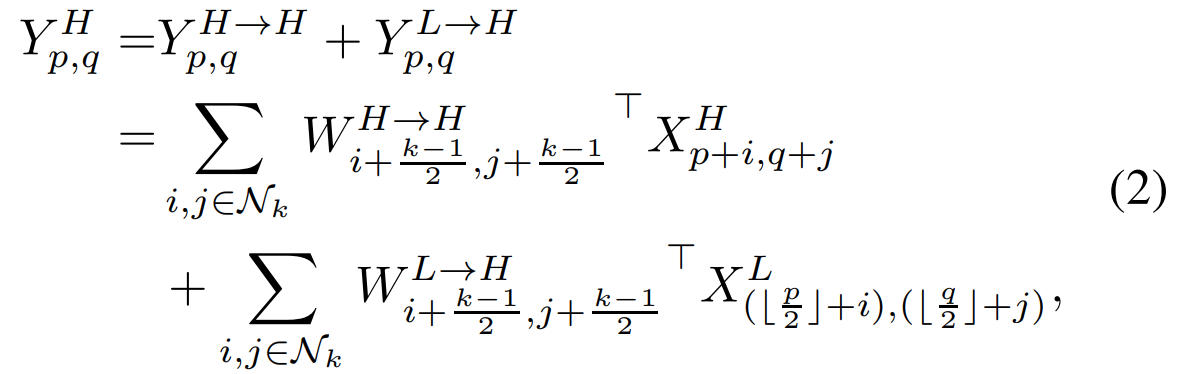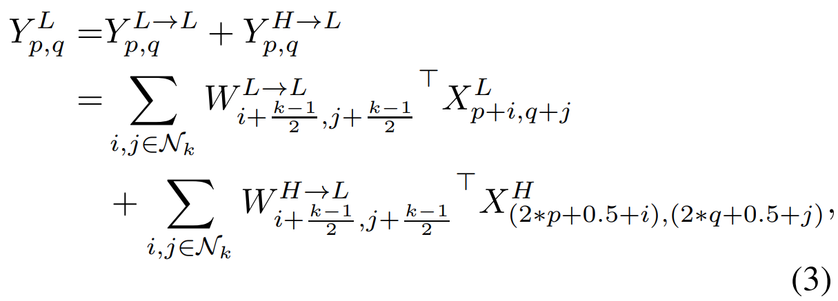 이때, 윗첨자에서 같은 문자로 표시되어 있는 것은 intra-frequency update 그리고 다른 문자로 표시되어 있는 것은 inter-frequency communication이라고 언급하고 있습니다. 따라서, 저희는 총 4개의 출력 특징 맵 $Y^{H \rightarrow H}, Y^{H \rightarrow L}, Y^{L \rightarrow H}, Y^{L \rightarrow L}$을 얻어야합니다. 이를 위해 합성곱 필터 $W$ 역시 $\{ W^{H \rightarrow H}, W^{L \rightarrow H}, W^{H \rightarrow L}, W^{L \rightarrow L} \}$과 같이 4개로 나누어줍니다. 그러면 각 필터는 저희가 얻고 싶은 4개의 출력 특징 맵을 얻게 되는 것이죠.
