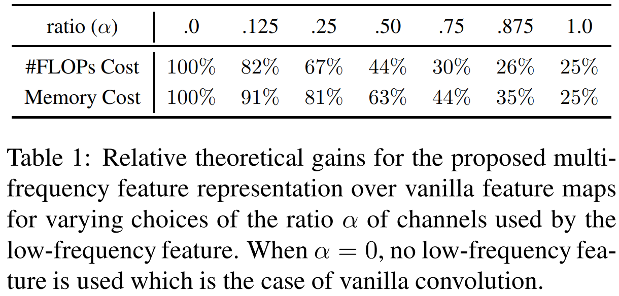 표1은 OctConv의 하이퍼파라미터인 $\alpha$에 따른 연산 비용에 대해서 말하고 있습니다. $\alpha$는 결국 저주파 영역을 얼마나 사용할 것인지에 대한 파라미터였습니다. 그리고 저희는 절반으로 4개의 합성곱 연산 중 2개는 절반만큼 줄어든 해상도에 대해서 합성곱 연산을 적용하기 때문에 당연히 $\alpha$가 커질수록 연산량이 줄어들 것이라는 것을 알 수 있습니다.