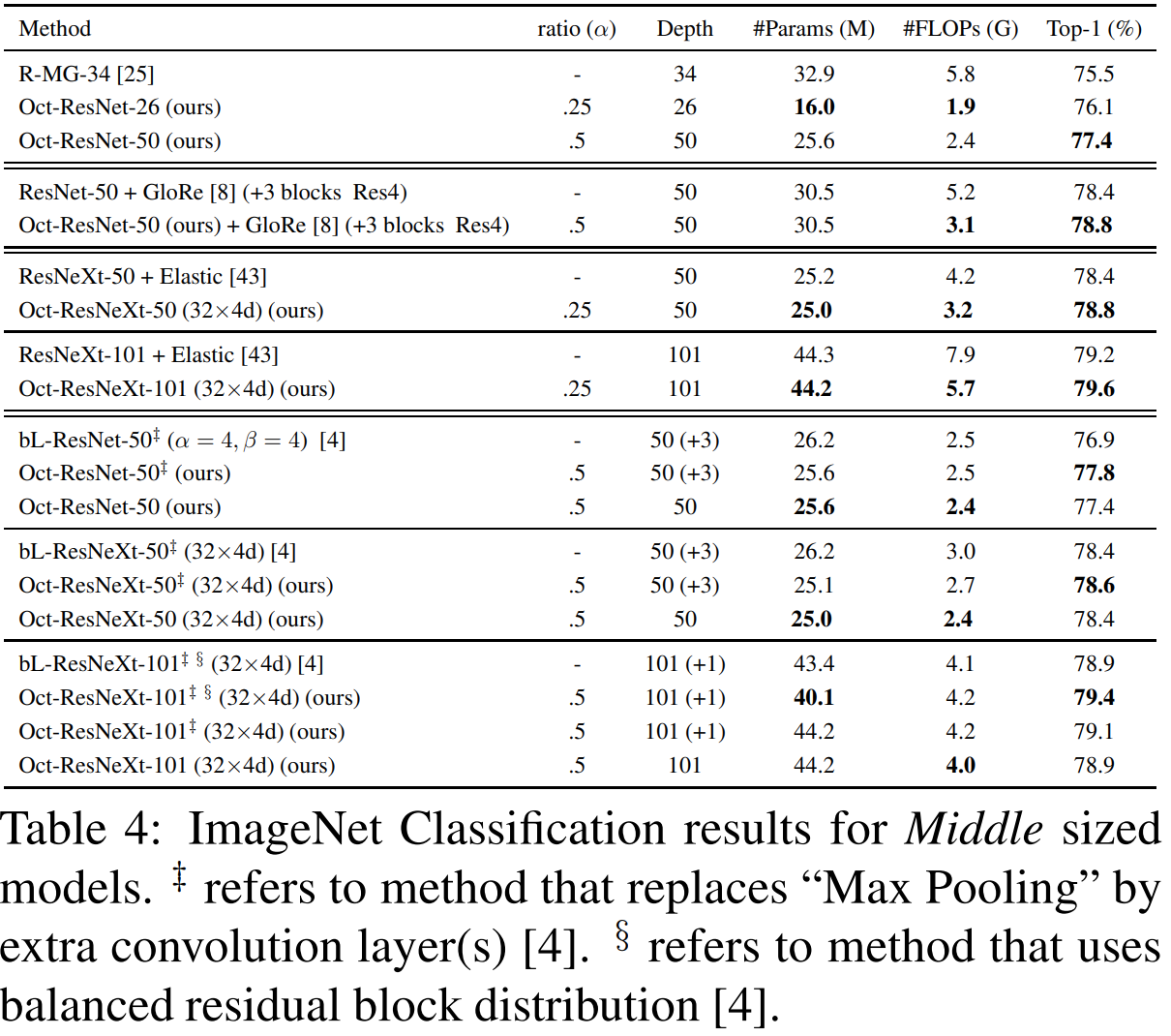 본 논문에서는 먼저 OctConv를 다양한 CNN 기반 모델에 적용하여 $\alpha \in \{ 0.125, 0.25, 0.5, 0.75 \}$에 따른 FLOPs vs Accuracy 그래프를 보여주고 있습니다. 눈에 띄는 특징 중에 하나는 모든 CNN 모델에 대해서 오목한 그래프를 보여주고 있습니다. 또한, $\alpha = 0.125$로 했을 때 가장 높은 성능을 얻을 수 있습니다. 하지만, $\alpha = 0.5$로 하게 되면 FLOPs는 거의 절반으로 줄어들지만 성능은 거의 차이가 없거나 더 높은 것을 볼 수가 있죠. 이러한 결과는 실제로 OctConv가 효율적으로 공간 중복 특징을 제거했다는 것을 의미합니다.