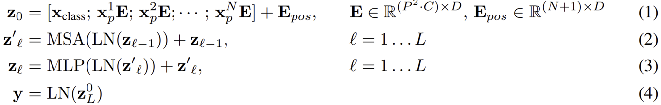 $$\mathbf{z}_{0} = [\mathbf{x}_{\text{class}}, \mathbf{x}^{1}_{p}\mathbf{E}, \dots, \mathbf{x}^{N}_{p}\mathbf{E}] + \mathbf{E}_{pos}$$