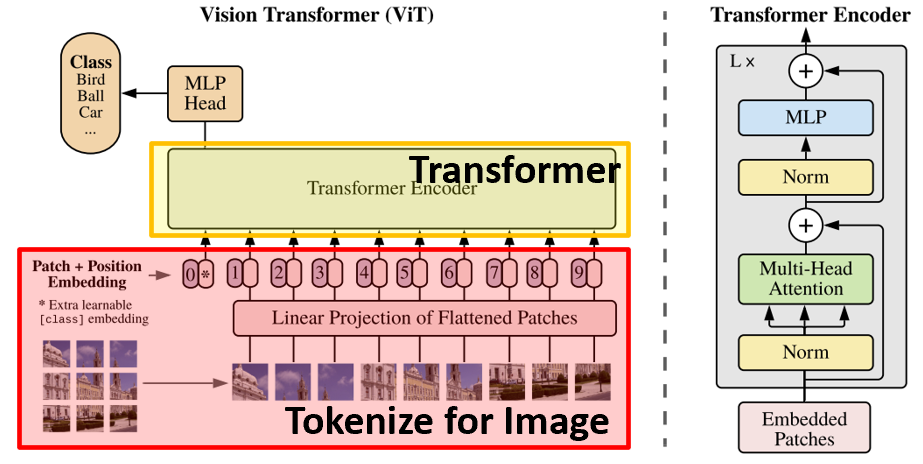 따라서 본 논문에서는 위 그림과 같이 입력 영상을 미리 정의된 패치 크기에 따라 패치로 쪼개줍니다. 이 과정을 Tokenize라고 하겠습니다. 그러면 입력 영상 $\mathbf{x} \in \mathbb{R}^{H \times W \times C}$은 $N$개의 패치로 이루어진 $\mathbf{x} \in \mathbb{R}^{N \times (P^{2} \cdot C)}$로 나누어집니다. 이때, 각 패치는 $(P, P)$ 크기로 구성되고 전체 패치의 개수는 $N = HW / P^{2}$임을 알 수 있죠.