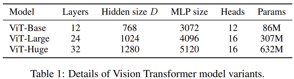 ViT는 사용하는 Transformer의 개수 (Layers), hidden dimension $D$, MLP의 개수, Head의 개수에 따라 Base, Large, Huge로 나눌 수 있습니다. 모델 구조에 따라 파라미터의 개수는 86M부터 632M까지 차이가 나는 것을 볼 수 있습니다.