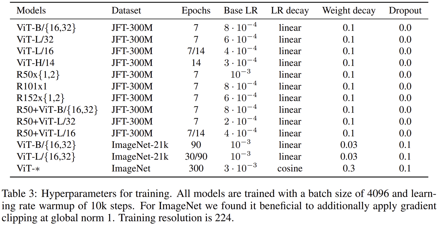 표3은 ViT과 ResNet의 학습 세팅을 보여주고 있습니다.
