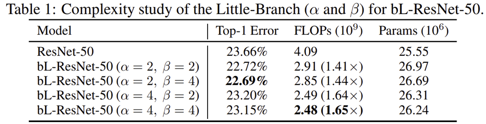 본 논문에서는 먼저 적절한 $\alpha$와 $\beta$ 값을 결정하기 위한 ablation study부터 수행합니다. 총 4개의 조합으로 실험하는 것을 볼 수 있죠. 결과적으로는 $\alpha = 2$ 그리고 $\beta = 4$로 했을 때 기존 ResNet-50과 성능 차이가 거의 나지 않기 때문에 해당 값을 default 값으로 다음 실험을 진행합니다.