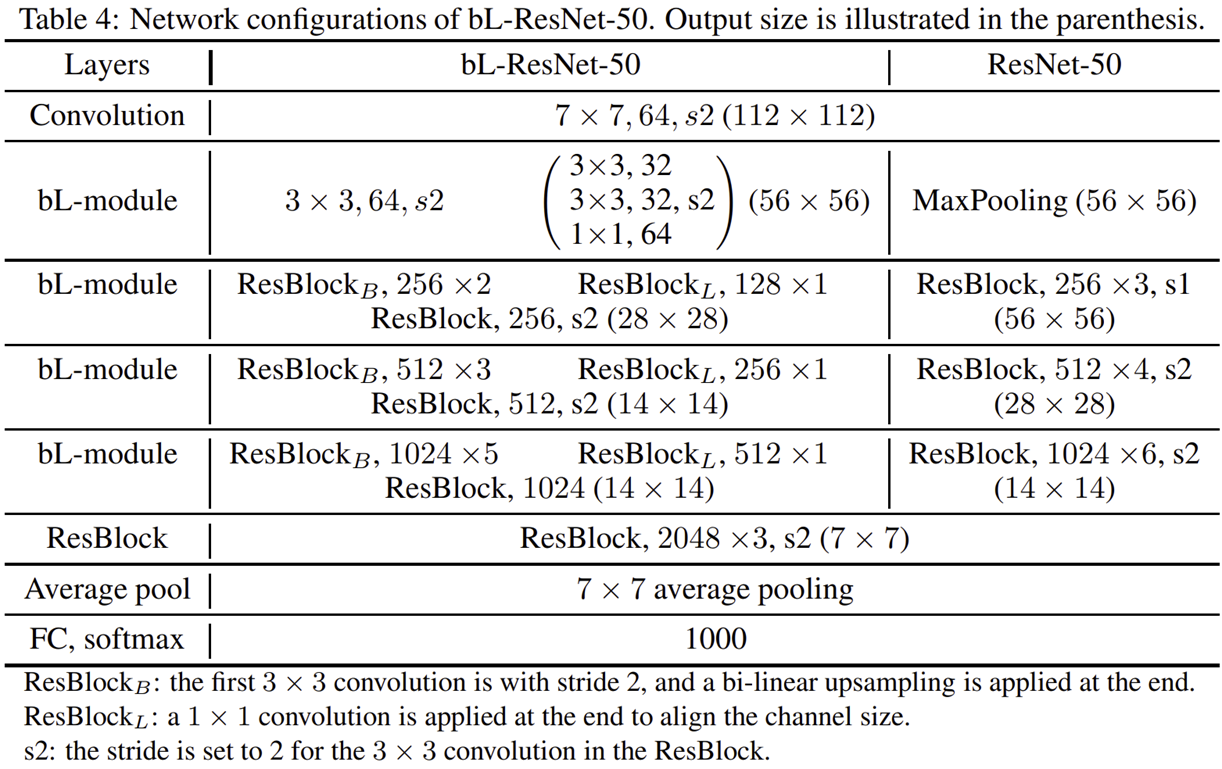 표4는 bL-Net을 ResNet-50에 적용했을 때 모습을 보여주고 있습니다.