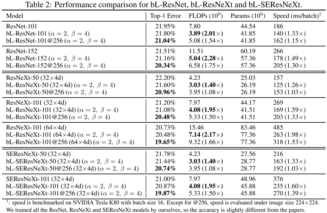 이번에는 더욱 다양한 ResNet-like 모델들 (ResNet, ResNeXt, SEResNeXt)에 Big-Little Module을 적용하여 비교를 진행합니다. 실험결과는 성능도 모두 약간 오른 것을 볼 수 있죠. 하지만 FLOPs는 높으면 2배 적으면 1.4배까지 감소하여 연산량이 크게 감소한 것을 볼 수 있습니다. 뿐만 아니라 입력 영상을 256으로 맞추면 기존 모델보다 성능 향상도 되지만 FLOPs도 적은 것을 볼 수 있죠.