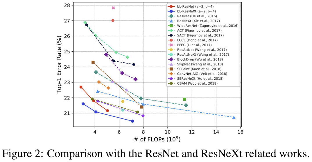 다음으로 ResNet 그리고 ResNeXt를 포함하여 효율적인 모델들 사이의 비교를 진행합니다. 가장 아랫줄의 파란색 선과 주황색 선이 각각 ResNet과 ResNeXt에 Big-Little Module을 적용했을 때 얻은 성능입니다. 다른 모델들에 비해 훨씬 오류율이 낮은 것을 볼 수 있죠.