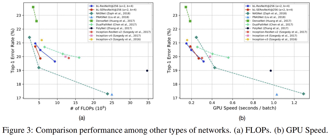 이번에는 더욱 다양한 ResNet-like 모델들 (ResNet, ResNeXt, SEResNeXt)에 Big-Little Module을 적용하여 비교를 진행합니다. 실험결과는 성능도 모두 약간 오른 것을 볼 수 있죠. 하지만 FLOPs는 높으면 2배 적으면 1.4배까지 감소하여 연산량이 크게 감소한 것을 볼 수 있습니다. 뿐만 아니라 입력 영상을 256으로 맞추면 기존 모델보다 성능 향상도 되지만 FLOPs도 적은 것을 볼 수 있죠.