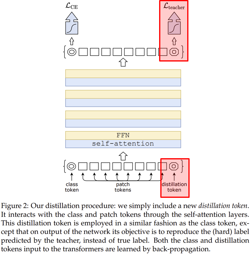그림 2는 DeiT의 전체 구조입니다. 제가 빨간색으로 표시한 부분이 기존 ViT와의 차별성이라고 이해하시면 될 거 같습니다. 이를 위해서는 지식 증류에 대한 내용을 빠르게 이해하고 넘어가도록 하겠습니다.